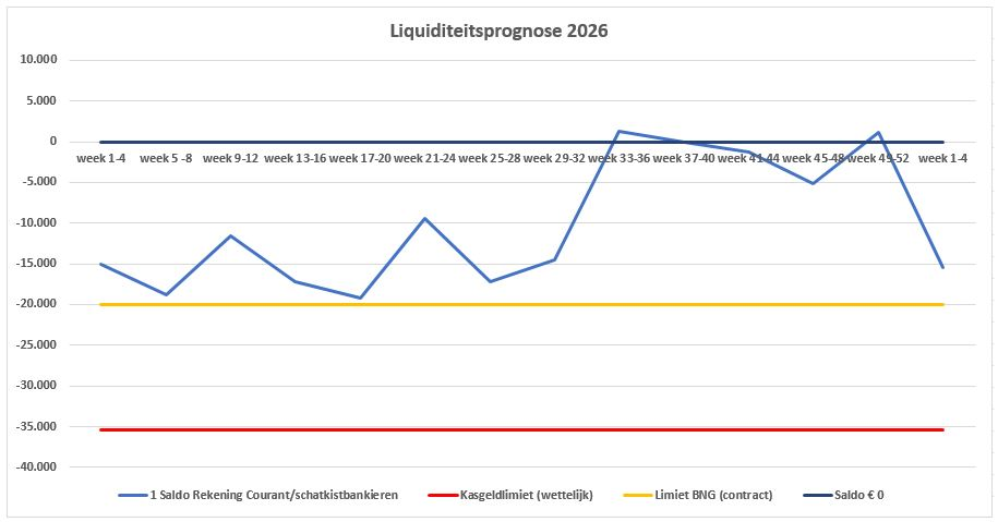 In de loop van het jaar toont de stand van de korte schuldpositie een wisselend beeld en is deze afhankelijk van het tempo en de fasering van de inkomsten en uitgaven gedurende het jaar. De kredietlimiet bij de BNG Bank is contractueel overeengekomen tot € 20 miljoen met een mogelijkheid tot overschrijding met € 5 miljoen tot een totaal van € 25 miljoen. De kasgeldlimiet ligt voor 2026 op € 35,4 miljoen. De opname van een langlopende lening van € 29 miljoen, zoals genoemd in 3.4.2, is verwerkt in de bovenstaande prognose van de korte schuldpositie.