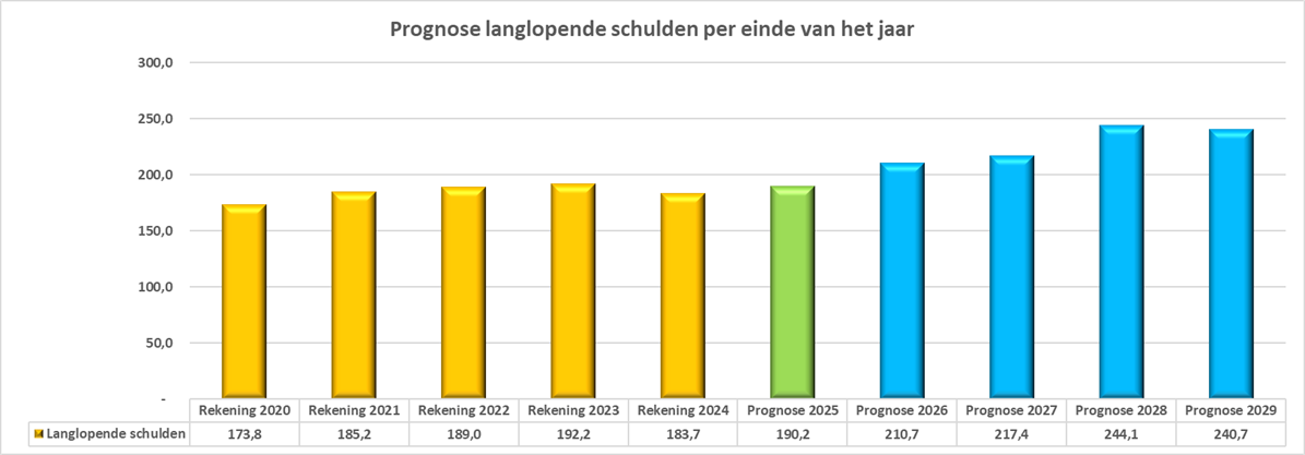 De geel gekleurde balken geven de werkelijke standen conform de jaarrekeningen 2020-2024 weer. De groene balk geeft de prognose van de eindstand van het jaar 2025 weer en de blauwe balken geven de prognose weer van de eindstanden van de jaren 2026-2029. De prognose van de langlopende schulden laat een stijgende lijn zien. Het jaarlijks berekende financieringstekort wordt afgedekt met het aantrekken van langlopende leningen. Het financieringstekort wordt voornamelijk veroorzaakt door de uitgaven op investeringen en aflossingen van huidige leningen. De omvang van de lening schuld heeft invloed op de ontwikkeling van de schuldquote. Voor de ontwikkeling van de kengetallen wordt verwezen naar & 3.2 Weerstandsvermogen en risicobeheersing.